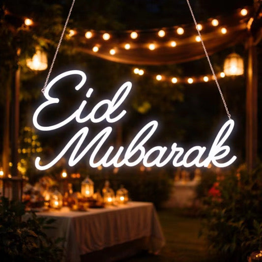 أضواء نافذة نيون مزخرفة باللون الأبيض لعيد مبارك، مصباح LED لعيد مبارك مقاس 15 بوصة مع سلك توصيل وجهاز تحكم عن بعد. لجزء عطلة المسلمين